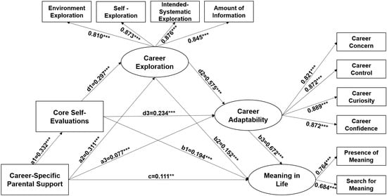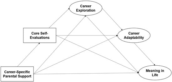 Core self-evaluations can influence job outcomes through the chain mediating effect of career exploration and career adaptability []. This suggests a linear impact relationship among core self-evaluations, career exploration, and career adaptability. Building upon the previous discussion on the impact of career-specific parental support on core self-evaluations and the impact of career adaptability on meaning in life, this study proposes the following research hypothesis 8: