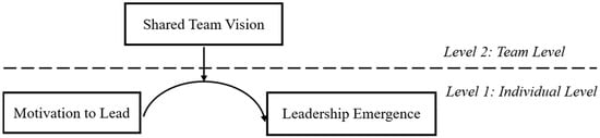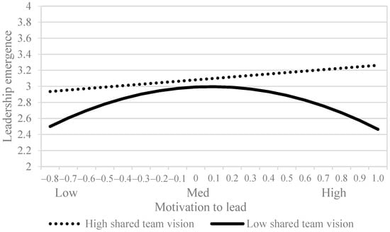 As noted by (), the context in which the claiming and granting of leadership is important. Specifically, in the context of a shared schema where the boundaries between a leader’s identity and a follower’s identity are permeable, there would be few identity conflicts and little tension over leadership (). It thus follows that a shared team vision may serve as a moderator that could effectively influence the level of inflection point of the inverted U-shape relationship between individual motivation to lead and emergent leadership. Shared team vision refers to “a common mental model of the future state of the team or its tasks that provides the basis for action within the team” (). A shared team vision can help build a supportive climate that facilitates informal leadership emergence () because it provides clarity and visibility about what team members are striving to achieve, which will guide the actions of individuals willing to claim leadership, and peer assessment of their leadership quality related to the leadership granting process (). When team members share a common vision, there will be great alignment between the team’s sense of purpose and individuals’ leadership claiming and peers’ leadership granting. Therefore, for teams with a high degree of shared vision, the inflection point of the inverted U-shape relationship between motivation to lead and leadership emergence will be high.