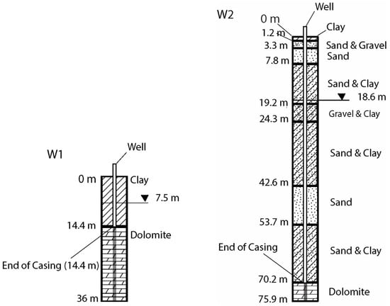 The well-boring log reports are included in Figure 1 (W1–W6) and Figure S2 (W7–W11). As can be seen from the well boring logs, the depth of the wells ranged from 30 m to 96.6 m beneath the ground surface (bgs), and the static water level varied between 7.5 m and 31.5 m bgs. All wells were screened within the dolomite and sandstone aquifer.
