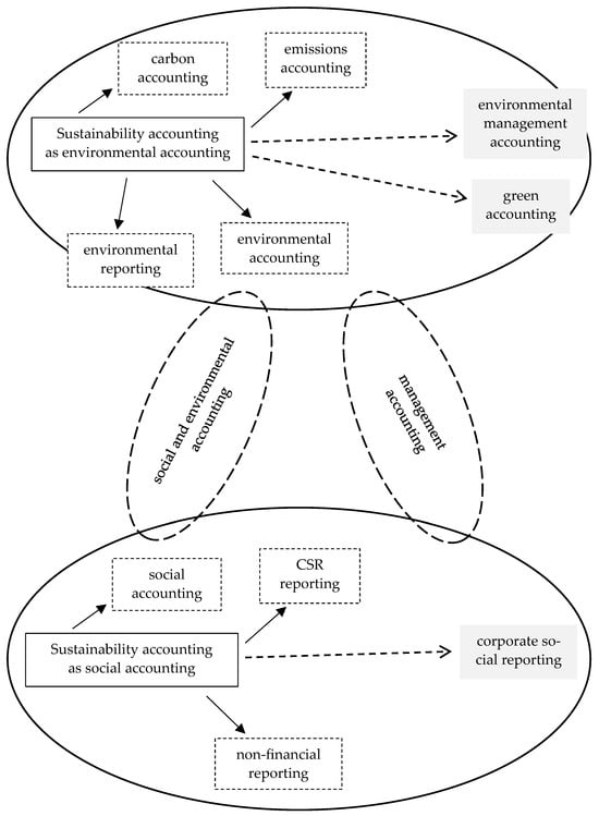 - The term sustainability accounting occurs in different interpretations and their synonyms. With regard to the frequency of occurrence, these are terms such as management accounting, carbon accounting, environmental accounting, social accounting, CSR reporting, environmental reporting, non-financial reporting, and emissions accounting, with a lower incidence (less than 300) of interpretations in the form of environmental management accounting, green accounting, social and environmental accounting, and corporate social reporting.Ultimately, the term sustainability accounting can be seen on two levels, namely environmental and social (Figure 3). Differences in the perception of this concept are related to the individual opinions of the authors themselves (experts from industry and academia) on the meaning and characteristics of the concept of sustainability. The intersection between the environmental and social spheres is social and environmental accounting, which highlights two areas of sustainability, and management accounting, which appears in three basic positions: as a synonym for sustainability accounting, as a traditional tool for the gathering and presenting of financial information to business managers and other stakeholders within an organisation, and as a guideline for businesses in environmental and social fields.