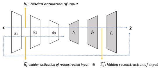 RaPP, a method for detecting novelty samples by exploiting hidden activation values, compares the input data and the reconstructed data, similar to ordinary reconstruction-based methods; however, RaPP also extends these comparisons to hidden spaces. An intuitive application of this idea would be to compare the activation in hidden space and the corresponding reconstruction in that hidden space; however, this direct comparison has no effect due to the lack of an explicit correspondence between members of encoding–decoding pairs of hidden layers during training. However, RaPP can compute the hidden reconstructions indirectly, using the hidden activations of the reconstructed input. This indirect computation is depicted in Figure 3.