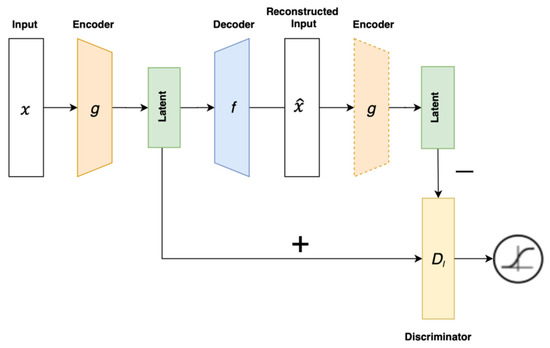 Similar to using a reconstruction method to minimize the reconstruction errors, the RaPP method can be further improved by minimizing the hidden reconstruction errors with the mean squared error loss. However, when an autoencoder architecture is deep, one needs at least as many loss functions as there are layers. It is not advisable to consider all deep hidden activations at once, as the original purpose of the autoencoder would be lost. Thus, we focused only on the last hidden activations, the so-called latent variables. Latent variables are usually treated as normally distributed continuous variables []. To reflect a distance measure between probability distributions, we must introduce adversarial training loss to the autoencoder.