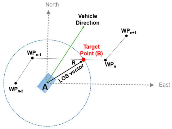 The step of searching the target point is to set a point, which is a location to be moved at the next epoch based on the current vehicle location and the selected waypoint. To set a target point, the enclosed-based line-of-sight (LOS) guidance algorithm [] is applied in this study. This method is to calculate the coordinates of a target point based on the slope of the straight line between the current waypoint and the previous waypoint and a circle with radius enclosing the current vehicle’s location (Figure 4). Details of the equations to calculate the coordinate of a target point using the enclosed-based LOS guidance algorithm can be found in []. The difference from the method in [] is if the distance between the current vehicle’s location and the current waypoint’s location is smaller than radius R, the coordinate of the target point is set to the coordinate of the current waypoint.