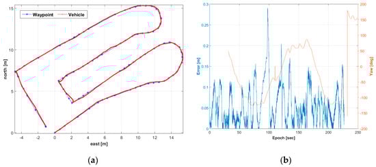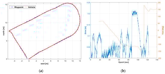 Figure 8a,b show the vehicle location with the waypoints for the second trajectory and the path-following error with the vehicle’s yaw, respectively. As seen in Figure 8, the second trajectory is composed of four curved sections and five straight-line sections. The number of waypoints was 90 and the length of the trajectory was 81 m. Compared with the first trajectory, the turning radius was narrower in the curve sections. The RMSE (Root Mean Square Error) of the path-following was 0.07 m. Specifically, the vehicle was following the path well, but the largest path-following error, which was 0.21 m, occurred in the end part of the first curve section. It means that the set radius for searching a target point was not perfectly operated to follow the desired path in the narrower curve section. Therefore, perfectly to operate autonomous driving, it is considered that an algorithm for adjusting the target search distance according to the turning radius should be added through various field tests.
