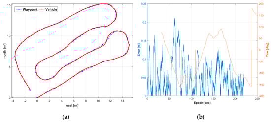 Autonomous driving results in the second trajectory: (a) driving path with waypoints; (b) path-following error with the vehicle’s yaw.