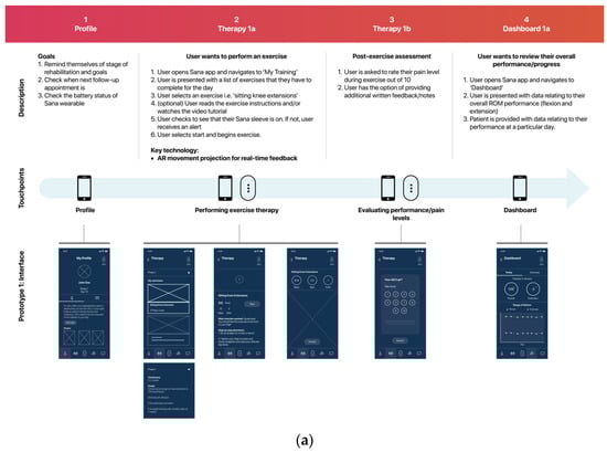Overall, the platform was positively received by target users, healthcare specialists, and technologists specializing in medical device development and design alike, which justifies the need to develop research and development further. Throughout our study, questions were raised regarding whether the simplicity of the implemented gamification concept would be enough to provide users with actionable visual feedback, informing them of whether they are performing their exercises correctly and accurately; determining this would require back-end software development. The next phase of the project will involve working with software engineers to develop the platform using Unity engine and testing a fully functional prototype; this will be reported in future research. Development efforts were primarily placed on the exercise, calibration, and progress review workflows, as these were seen as critical components of the proposed system. In the future, other key functionalities of the system, such as chat and my profile will need to be refined to complete the application’s service. An integral part of assessing the overall efficacy of the proposed system will involve developing the Sana sleeve and clinician’s dashboard and conducting a clinically controlled longitudinal study using the entire system (Sana app, sleeve, and dashboard). Developing the Sana sleeve will require establishing a team consisting of mechanical and material engineers who are specialists in this area. However, academic groups [16,31,32] and commercial organizations, such as Loomia, have developed similar smart textile technologies that could be integrated, reporting high success rates. There is strong evidence to suggest that a smart textile approach is a potential future direction.