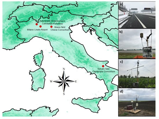 The four experimental sites where the Meteo Expert Centre (MEC) algorithm is implemented: The Autostrada Pedemontana Lombarda motorway (a), the Milano Linate airport airstrip (b), the maize field in the Chiese Consortium (c), and the tomato field in the Capitanata Consortium (d).