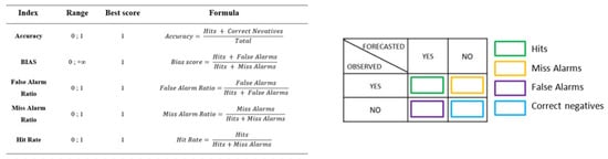 Finally, the determination coefficient summarizes in a single value how much the analyzed quantity differs from the regression model: the more the index approaches the unit, the better is the performance of the model used. In addition to the LST prediction, the estimation of the ice alert code probability is valued through a contingency table (Figure 2), in order to evaluate the algorithm with familiar skill scores such as the accuracy, bias, false alarm ratio (FAR), miss alarm ratio (MAR), and hit rate (HR).