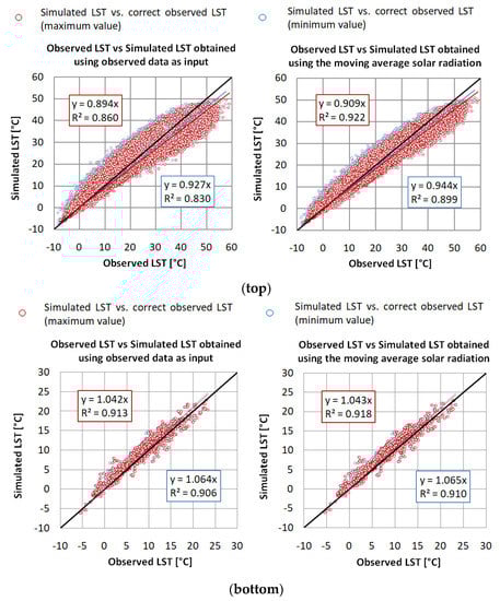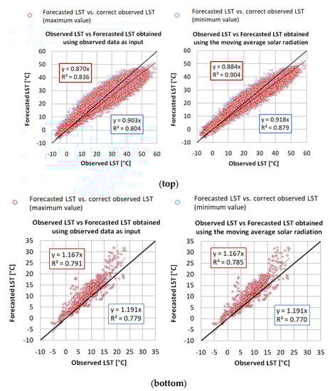 As mentioned in Section 3, the results are shown both considering the minimum and maximum value of LST. In particular, red dots are representative of comparison between simulated/forecasted LST and the maximum value of corrected observed LST, while blue dots indicate the results obtained by the comparison between simulated/forecasted LST and the minimum value of corrected observed LST.