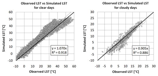Scatterplot between observed vs. simulated LST over the “Linate” station point during clear (left) and cloudy (right) sky days.