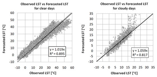 Scatterplot between observed vs. forecasted LST over the “Linate” station point during clear (left) and cloudy (right) sky days.