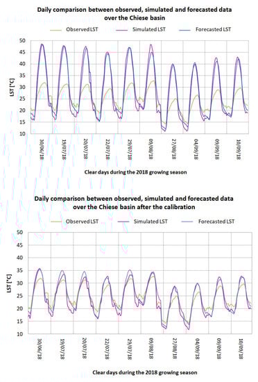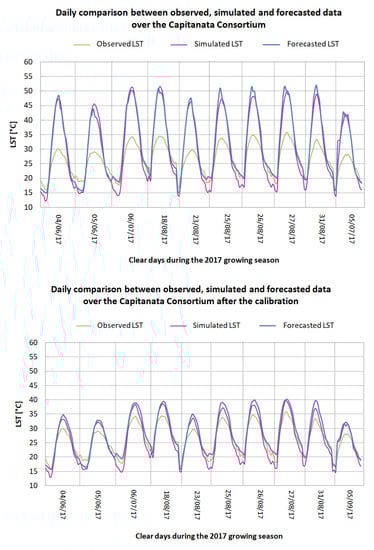 The Figure 7 and Figure 8 highlight the LST trend for observed data in comparison with simulated and forecasted values before and after the calibration of the β coefficient over the Chiese (Figure 7) and Capitanata (Figure 8) consortia, respectively. In both the cultivated fields, the applied tuning sensibly improved the performance and both simulations and forecasts match more closely the measured data at the two station points. For the sake of brevity, this comparison has been carried out only during clear sky days in the growing season, when the incoming solar radiation is higher; hence, ten non-consecutive days are here selected during two different growing seasons: 2018 for the Chiese and 2017 for the Capitanata, whose average duration is generally about five–six months from April till September both for maize and tomato growing season.