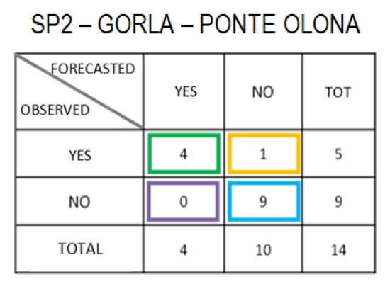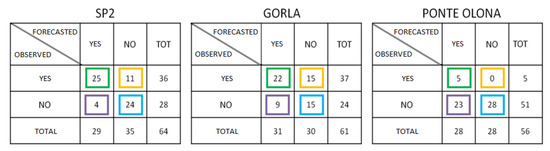 Figure 9 and Figure 10 present the contingency tables during clear and cloud sky days, respectively, for the three station points: SP2, Gorla, and Ponte Olona. It is worth mentioning that the total number of ice risk events during cloudy days is very low, which is consistent with the typical meteorological conditions of this region in northern Italy: in fact, the presence and risk of ice generally is high during clear nights only. This explains equal results in the three neighboring station points under overcast sky conditions.
