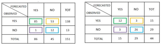 For the ice alert code forecast, in this second case-study, the algorithm performance is studied by comparing the output initially to the joint distribution of the forecasted air relative humidity and LST and, then, both the observed values. As illustrated in Figure 11, 2 × 2 contingency tables are created both for clear and cloudy days and the main statistical indexes are calculated for performance evaluation (Table 13), taking into account only those days where hourly air temperatures are less than 4 °C.