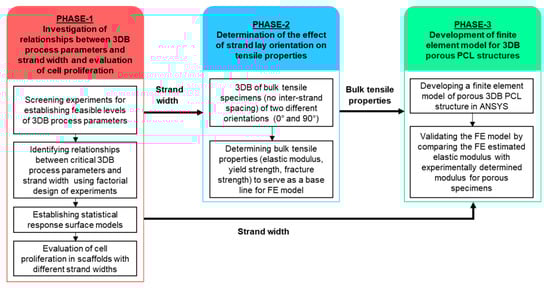 This study aimed to contribute to our overall understanding of the process–structure interactions in melt extrusion-based 3DB of PCL. The focus was on experimental characterization and subsequent statistical and finite element (FE) modeling of the effects of process parameters on structural and tensile properties of bioplotted PCL. The study was conducted in three interconnected phases (Figure 1). In Phase-1, the relationships between strand width and extrusion pressure, nozzle speed, lay orientation, and strand length were characterized. A regression model to estimate the strand width based on critical process parameters was developed and validated. To test the validity of the hypothesis that the strand width has an effect on the cell proliferation within a scaffold, two sets of porous scaffolds (Ø 20 × 2 mm, 0°/90° strand lay orientation) with contrasting strand widths resulting from extreme combinations of extrusion pressure and nozzle speed within the established design space were tested with NIH/3T3 fibroblast cells over 7 days in culture. Once the process–structure characteristics were understood, in Phase-2, the effect of stand lay orientation on tensile properties of bulk bioplotted PCL structures was determined. In the context of this study, bulk refers to a specimen bioplotted with non-porous gage sections, i.e., adjacent strands printed with no inter-strand spacing. These bulk tensile properties were critical in creating the FE model. Finally, in Phase-3, using the strand width data from Phase-1 and tensile testing results from Phase-2, an FE model was developed and validated to computationally estimate the tensile strength of 3D bioplotted porous PCL structures.