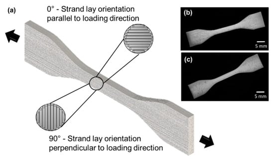 The tensile test specimens were designed as per ASTM D638 (non-rigid plastics, type IV) with two different strand lay orientations [] (Figure 2). In the 0° configuration, all strands were oriented along the direction of tensile loading. In the 90° configuration, all strands were oriented perpendicular to the direction of tensile loading. These two strand lay orientations were chosen due to their prevalence in tissue engineering scaffolds literature [,,,]. Three bulk samples were bioplotted for each configuration using a Ø 0.3 mm nozzle at 120 °C with an extrusion pressure of 0.5 N/mm2, a nozzle speed of 1.4 mm/s, and with a layer height of 0.26 mm. It should be noted that experimentally characterizing the bulk tensile properties across all combinations of bioplotting parameters was not feasible due to the time and resource-intensiveness associated with fabricating the bulk PCL specimens. Hence, the aforementioned representative set of bioplotting parameters was chosen from within the Phase-1 design space (Table 1) as it was successfully used in a previous study [].