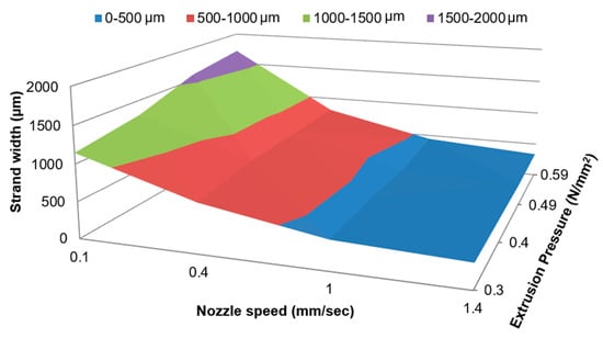 ANOVA results and the post hoc test show that extrusion pressure, nozzle speed, and their interaction had a statistically significant effect (p < 0.001) on the strand width. The strand widths (mean ± standard deviation) for the 16 combinations of extrusion pressure and nozzle speed are presented in Table S1 and the corresponding response surface plot is presented in Figure 3. A general trend of decrease in strand width with increasing nozzle speed and decreasing extrusion pressure was observed.