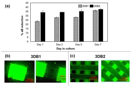 Results of % aB reduction for the 3DB1 and 3DB2 scaffold designs are presented in Figure 4a. The % aB reduction of both designs increased over time in culture, signifying an increase in cell proliferation. Overall, the % aB reduction for the 3DB2 scaffolds was higher than that of the 3DB1 scaffolds. Results from the two-way ANOVA show that both the scaffold design and the days in culture had a significant effect on % aB reduction (p < 0.05). Tukey’s HSD post hoc results show that the differences in % aB reduction between scaffold designs (pairwise comparisons) were significant on days 1, 3, and 5, but not on day 7. The Live/Dead® images show that the viable cells (green dots) adhered to the strands of both scaffold designs (Figure 4b,c). Dead cells, which would have manifested as red dots, were not observed, indicating cell viability approximating 100% in both designs.