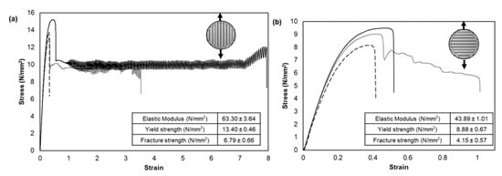 Stress versus strain plots for the 0° and 90° strand lay orientation configurations are presented in Figure 5. The elastic modulus, yield strength, and fracture strength determined from these plots are also specified. The plots show that as the specimens of both configurations started to yield, the stress values decreased, but the time to fracture was shorter for the 90° configuration. For the 0° configuration, the cyclic stress undulations after a strain of 1 can be attributed to the spasmodic plastic deformation of individual strands in the specimens. This phenomenon was not observed in the 90° configuration. The trends observed for strain values less than 1 are similar to tensile characteristics observed in viscous polymers [,,]. Student t-test results indicate that for each of the three tensile measures, the differences between specimens of 0° and 90° configurations were statistically significantly different (p < 0.05), implying that the strand lay orientation had a significant effect on tensile properties of bioplotted PCL. The 0° configuration had higher values for all three tensile measures.