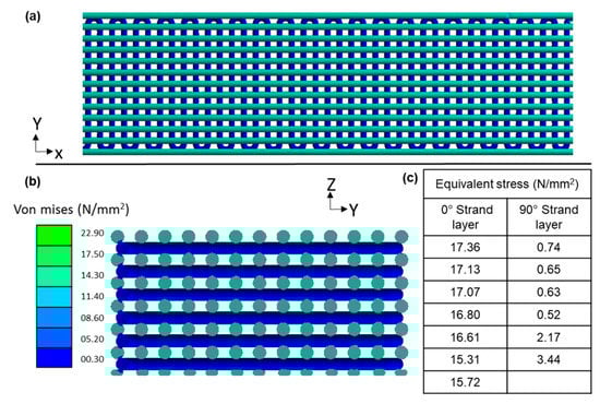 The meshed FE model of the tensile specimen gage with strand width to inter-strand spacing ratio of 1:1 contained 2,045,737 triangular elements and 3,424,882 nodes. The stress distribution in the model is presented in Figure 6. The average stress in the 0° and 90° oriented strands was 16.57 N/mm2 and 1.36 N/mm2, respectively. The higher stress in the 0° oriented strands is on account of them being aligned along the direction of loading. The average reaction force determined by averaging the force on all the nodes at the fixed end was 113 N, corresponding to a strain of 0.59 acting across a cross-sectional area of 5.09 mm2, resulting in an effective elastic modulus of 37.51 N/mm2 (Equation (1)).