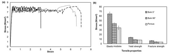 (a) Stress versus strain plots for three porous tensile measures represented by lines with different types of line style and (b) Comparison of experimental tensile properties of bulk and porous specimens. Error bars denote standard deviation (n = 3).