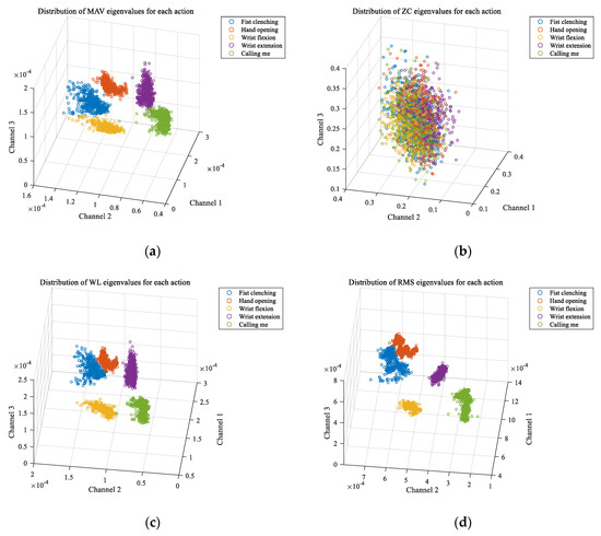 The time and frequency-domain features were extracted first and the scatter plots in three channels were drawn, respectively. Figure 6 exhibits the spatial distribution of each feature. It could be noticed that the spatial distribution of MAV, WL, and RMS was more apparent and easier to distinguish. After all features including wavelet coefficient was extracted, eigenvectors were input into the BP neural network for action recognition. Table 1 lists the classification accuracy of each action. it was clear that MAV, WL, and RMS still performed better than other features. Meanwhile, it was clear that the classification accuracy of a single feature on some actions was not so high, so MAV, WL, and RMS were combined and sent to the classifier for a subsequent three-feature-combination joint action classification.