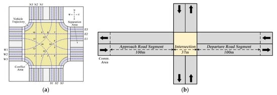 Diagram of the two-way six-lane unsignalized intersection. (a) Intersection configuration; (b) road segment configuration.