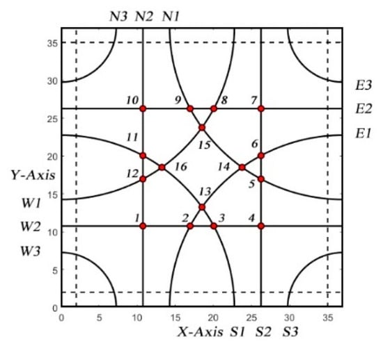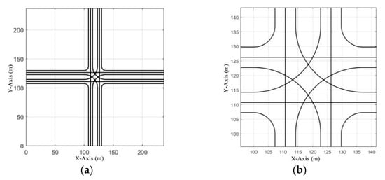 We operated the simulation experiments using MATLAB (R2018a, MathWorks, Natick, MA, USA), which provides a cost-effective, risk-free environment to explore the traffic management strategy and evaluate the proposed TICA algorithm. The specifications of the system used for the simulation are: Intel Core TM 2 processor, Quad CPUQ6700 @ 2.60 GHz, RAM-8 GB, and OS-Windows 10 Home 64-bit (Intel, Santa Clara, CA, USA). We selected a signal-free intersection of Tuanjie Avenue and Fenglin Road in Wuhan city, Hubei Province, China, as a test scenario, whose geometry is shown in Figure 13. For the sake of simplicity, the intersection has been simplified in the simulated road model, which contains three lanes at each entrance for “turn left”, “go straight”, and “turn right”, respectively.
