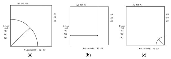 Potential trajectories of vehicles. (a) Turn left from S1; (b) go straight from S2; (c) turn right from S3.