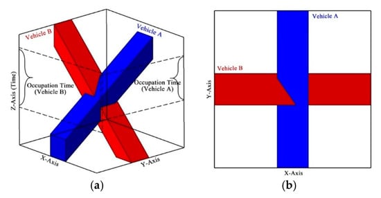 As shown in Figure 3, the potential trajectories of vehicles coming from one direction are assumed to be ideal geometrical lines. However, vehicles cannot be regarded as particles because the external sizes of vehicles have an impact on the occupation state of conflict points. As shown in Figure 4, the spatio-temporal trajectory of one vehicle is similar to a prism, and there will be a collision if the trajectories of two vehicles predicted by the intersection manager overlap, which indicates that the two vehicles have occupied the same conflict point at the same time.