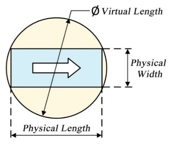 where lA is the physical length of the vehicle, wA is its physical width and LA is its virtual length. The reason why we replace the original length with a larger artificial length (as shown in Figure 6) is to eliminate both communication and control errors caused by communication delay and packet loss, in order to prevent collisions accidents.