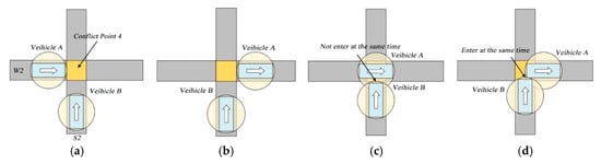 As shown in Figure 7a,b, the conflict point will be occupied when the head of vehicle A enters the overlapping region, and it will be released when the rear of the vehicle A entirely leaves the overlapping area. There will be no collision in Figure 7c if vehicle B does not contact the conflict point when vehicle A is occupying it. On the contrary, there will be a collision in Figure 7d.