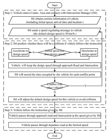 - Step 1: Assume that all the vehicles will communicate with the intersection manager in turn according to their arrival time after entering the communication area. Next, vehicles will report their motion information, including initial speed (in the range of 10 to 50 km/h), arrival time, and location via V2I technologies. At the same time, the intersection manager will send a speed regulation message to the vehicle, and the design speed is set to 30 km/h by default in order to keep a balance between efficiency and safety (speed limit is set to 50 km/h).