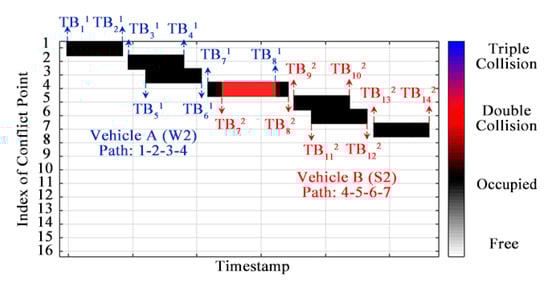 As shown in Figure 8, vehicle A goes along lane W2, which will occupy the first, second, third and fourth conflict points successively, and vehicle B goes along lane S2, which will correspondingly occupy the fourth, fifth, sixth and seventh conflict points. Each vehicle will occupy the conflict points on the path for a while and leave black time blocks on the graph. There will be no collision if they do not occupy the fourth conflict point at the same time. Otherwise, the overlapping areas will be marked red, representing a collision accident. The calculation method of the occupation time will be introduced later.