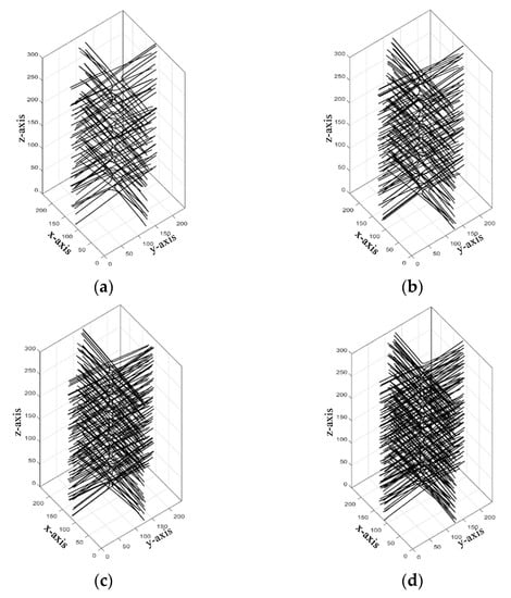 In the simulation experiments, we applied the proposed TICA method to resolve conflicts in the intersection area. Examples of optimal spatio-temporal trajectories for vehicles generated by TICA are illustrated in Figure 14. As shown in Figure 14, the x-axis and y-axis represent the location of vehicles in the intersection area, and the z-axis represents the timeline of the simulation. The velocity sequence of each vehicle can be obtained from the spatio-temporal trajectories. The results of conflict detection and resolution for the 12 test scenarios are illustrated in Figure 15. As shown in Figure 15a, the number of potential collision accidents increased with the volume of traffic, which demonstrates the necessity for conflict resolution. As shown in Figure 15b, the number of vehicles that had to adjust their design speed also increased with the volume of traffic.