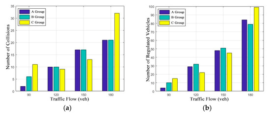 Results of conflict detection and resolution for different test scenarios. (a) The number of potential collisions; (b) the number of regulated vehicles.