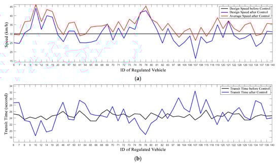 Impacts of conflict resolution on regulated vehicles in the 150A test scenario. (a) Vehicle speed before and after speed control; (b) transit time before and after speed control.