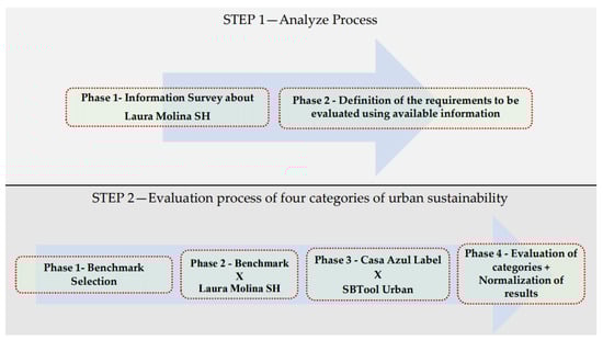 The study was organized into two main steps. The first one was subdivided into two phases dedicated to analyzing the process, which included gathering information regarding the classification criteria and the characteristics of the Laura Molina social housing. The second one described the evaluation process of four categories of urban sustainability, measuring indicators with the respective analysis of results. The steps are shown as follows: