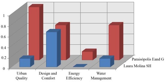 The Paraisópolis Buildings E and G results, adopted as a reference, were assimilated with the highest score proposed by the SBTool methodology, while the case study, Laura Molina SH, was scored by comparing it with the presented values by the benchmark. After the score was established, and the normalization formula was applied, the weights for each category were calculated considering the influence of the indicators’ impacts in the region where Laura Molina is located [,].