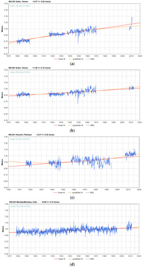 Figure 3 presents the MSL of Aden, Mumbai, and Karachi. The figure also presents the MSL of Fremantle, the other long-term tide gauge of the Indian Ocean. Opposite to Aden, Mumbai, and Karachi, Fremantle is not a segmented record. In the pictures, from sealevel.info (www.sealevel.info), the MSL is claimed to be clear of the regular seasonal fluctuations due to coastal ocean temperatures, salinities, winds, atmospheric pressures, and ocean currents. The clearing process includes quite complicated operations that might be doubted, however marginally affecting the computed trends. Figure 3a,b presents the MSL for Aden, with data from NOAA (tidesandcurrents.noaa.gov/) and from PSMSL. The data from NOAA are simply an earlier version of the PSMSL data. The earlier version still available from NOAA is called (n − 1), and the latest version from PSMSL is called (n). As the databases of climate parameters are unfortunately unstable, it is common to have historical data revised from one version to the other.