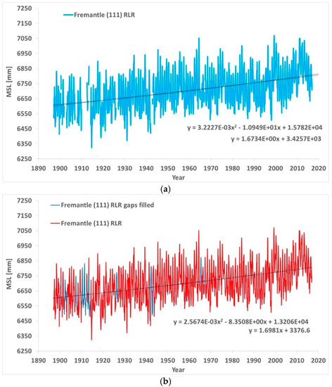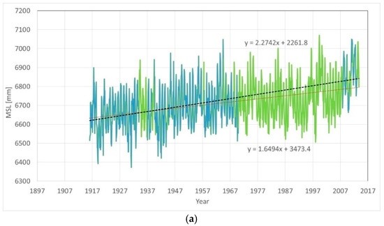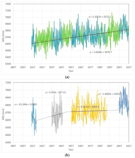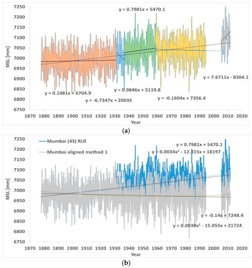 Figure 7a,b presents the latest Karachi results, data from January 1916 to November 2016. Figure 6a shows the linear fittings applied to the four segments. Figure 6b shows the MSL aligned compared to the PSMSL RLR data.