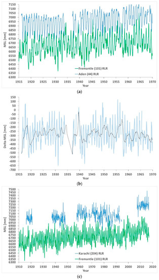 In contrast to [34], other studies [33,35] computed a large sea level rate of rise for Mumbai, of +0.91 mm/yr over the time window 1878–1982. The differences [33,36] were attributed to, “somewhat different changes of mean annual land level (or relative sea level) obtained from the two sets of records to our generally earlier and later records”. Based on the linear fitting of the MSL data, in the latest PSMSL RLR data set, the rate of rise from January 1978 to December 1981 was +0.79 mm/yr. When the data were realigned, it was −0.24 mm/yr. Emery and Aubrey [35] did not include Aden and Karachi in their analysis.