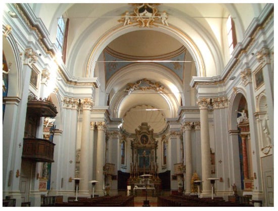 A further difference which can be considered is the presence of a dome at the transept level and the barrel-vaulted roof made of plaster on bricks inside S. Dominic of Imola, whereas in Foligno, there is a simple open gable roof in wood. The presence of the dome creates a focus effect, which is unpleasant for musical performance []. In a similar way, the disrupting delayed reflections in Foligno are given by the apse. Furthermore, in Foligno, the measurements were undertaken when the church was almost completely empty, without any furniture or seats.