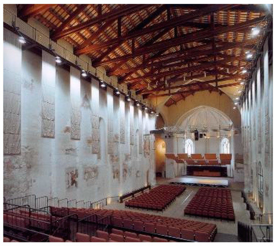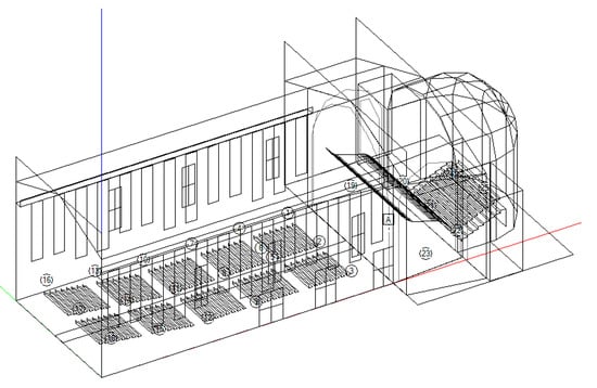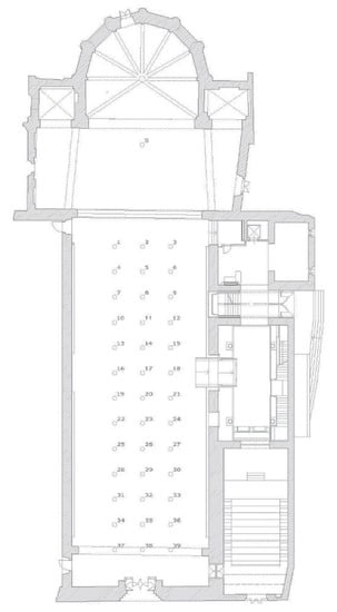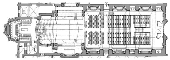 A similar organization can be found in S. Dominic of Imola, designed to have a total capacity of 410 seats, planned to be along the nave only []. The stage for the orchestra would be at the center of the transept, equipped with an acoustic shell. Two fire exits have been designed between the 2nd and the 3rd niche of the nave, as indicated in Figure 6. A cloakroom and a box office can be allocated beneath the highest seats of the sloped stalls, close to the main entrance. Services and washrooms have been assigned to the western extension of the church, externally to the auditorium.