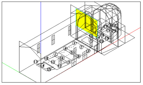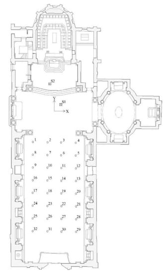 The sound source was located in the presbytery area, simulating the location of a musician playing on the stage. In particular, in S. Dominic of Imola the loudspeaker was not installed along the median axis in order to avoid focal effects owed to the geometry of the circular dome [], while in S. Dominic of Foligno this problem did not transpire.