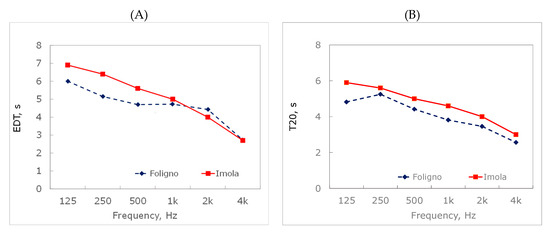The graph of EDT similarly indicates a reduction in terms of sound energy for both churches. To be precise, the EDT related to S. Dominic of Imola has been reduced of more than 4 s at 125 Hz, with a similar downward peak at 500 Hz reaching a value of 1.8 s. The trend line related to S. Dominic of Foligno is very similar to the results related to the T20, even if in the graph of EDT is shifted 0.4 s downward.