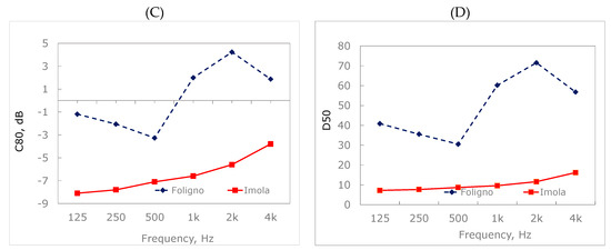 Because of its permanent desecration, the acoustical treatments as mentioned in Section 6.2 can be adopted for the church of S. Dominic of Foligno by being applied to the measurement configuration related to 1994. In S. Dominic of Imola, instead, the acoustical treatments have been planned to be completely reversible, due to the necessity of daily masses that only allows a temporary conversion to an auditorium []. The graphs of Figure 12 show the simulated values based on the model digitally reproduced [], with the acoustical treatments applied as discussed previously. The graphs in Figure 12 are obtained by considering the average values of all the simulated points.