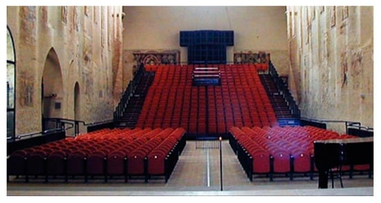 Because the desecration of the church was permanently given to S. Dominic of Foligno in 1980 by the local authorities, the simulated results of the acoustical project previously mentioned were developed in order to match the criteria of an auditorium [], counting on a definitive transformation suitable for musical concerts and congress meetings. As such, the preliminary acoustical studies were finalized with the analysis of all the three measurement campaigns, realized in the following time period: