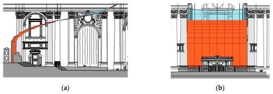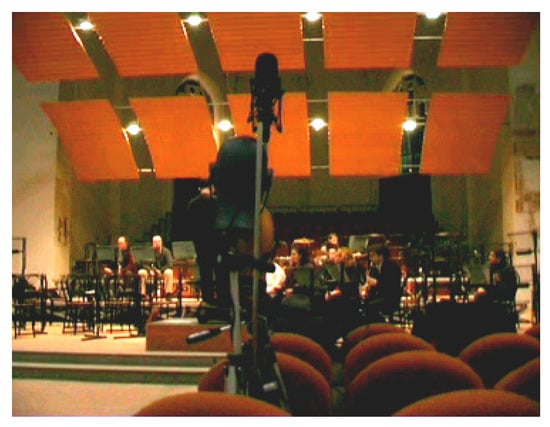 Because the single nave of S. Dominic of Foligno can be approximated to a shoe-box room for its pure linearity, as shown in Figure 7, the spreading sound waves generated onto the stage towards the nave hit the side walls producing strong lateral early reflections. The intension of the acoustical project was to equally distribute the early reflections across the space avoiding focal echoes from the apse []. As such, one of the first steps of the project design was to redirect the sound energy by the insertion of suspended wooden panels above the orchestra. These reflecting panels, as shown in Figure 8, are equipped with engines, so that both orientation and height can be controlled. The rotation and the height change of the reflecting panels allow to create all types of a desired shell, in accordance with the nature of performance.