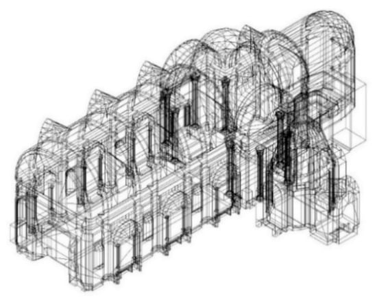 Both the churches of S. Dominic have a plan layout of a single nave, surmounted by a barreled vault in Imola and by a gable trussed roof in Foligno []. The linearity of the nave, very accentuated in Foligno, is disrupted in Imola by the presence of framed niches at the side walls. The apse is edged for both churches, in the shape of a half decahedron in Imola and half dodecahedron in Foligno. Furthermore, at the east side of the transept of S. Dominic of Imola there is a coupled volume, composed of the chapel of the Rosary, which has a shape of an oval cylinder covered by an elliptical dome in baroque style []. Table 1 below summarizes the different features inside the two churches.
